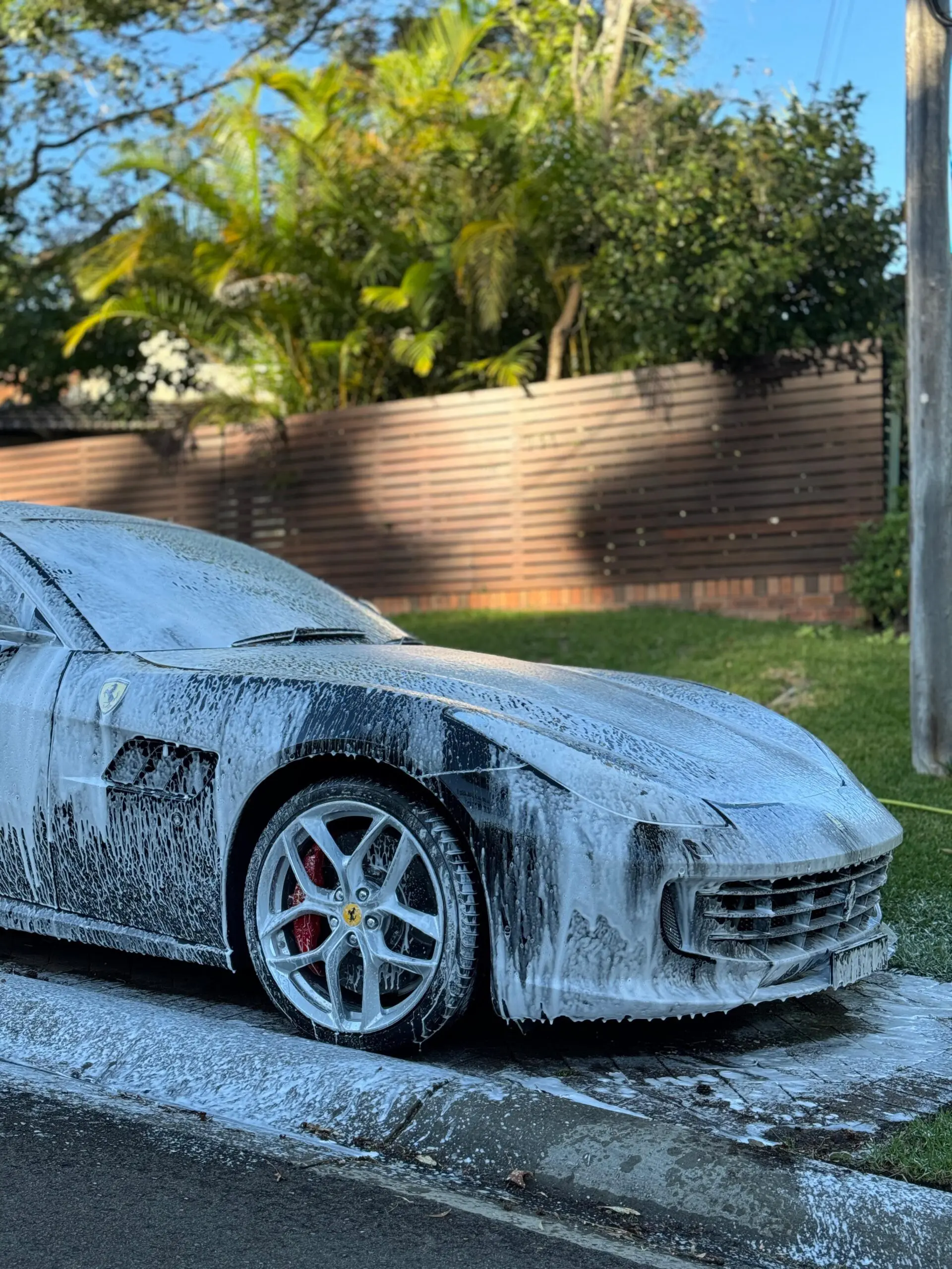 High-pressure snow foam rinse – This is an essential part of car detailing where we begin with a thick layer of snow foam to loosen dirt, grime, and surface contaminants. The foam breaks down particles without rubbing, reducing the risk of swirl marks.